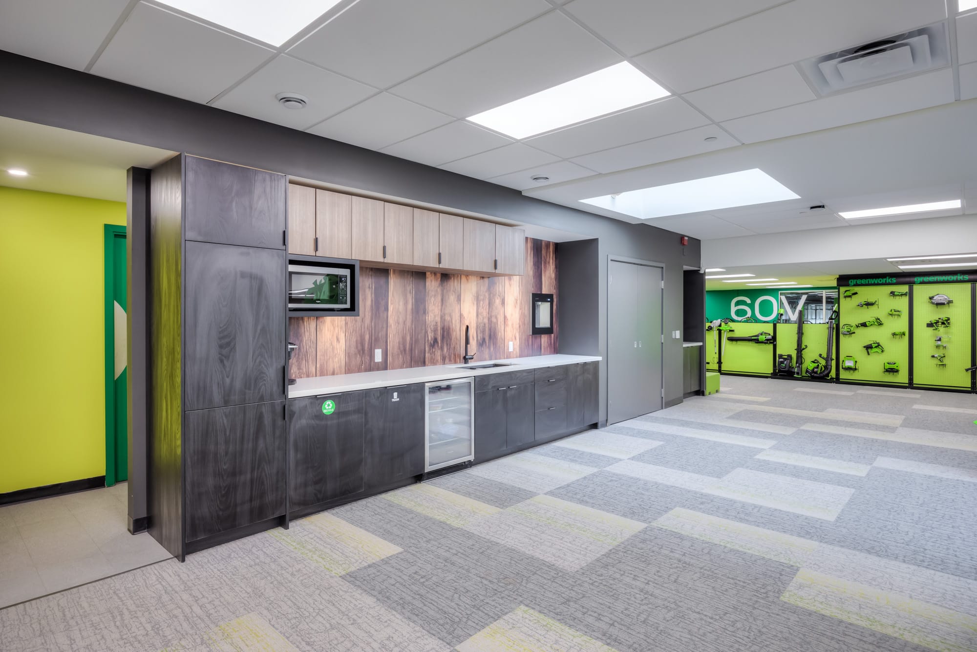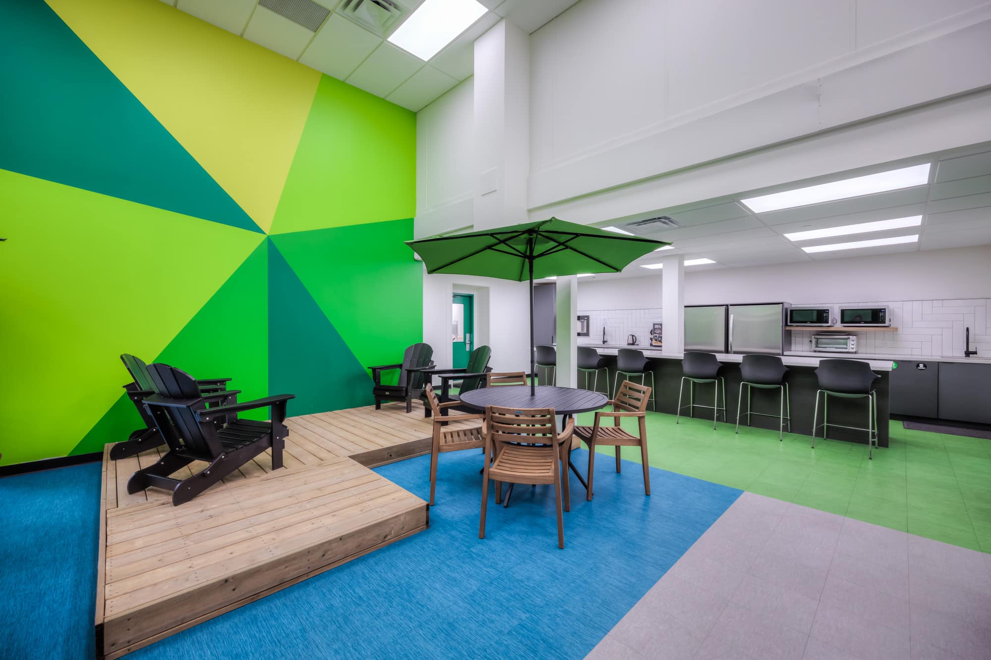 In the lunchroom, Studio Forma employed creative flooring and wall paint designs to fashion a cozy lounge area, evoking a sense of nature indoors. Custom millwork, adorned with murals echoing the outdoors, not only enhanced the aesthetic appeal but also fostered collaboration among team members, creating a welcoming and conducive environment for shared ideas and innovation.