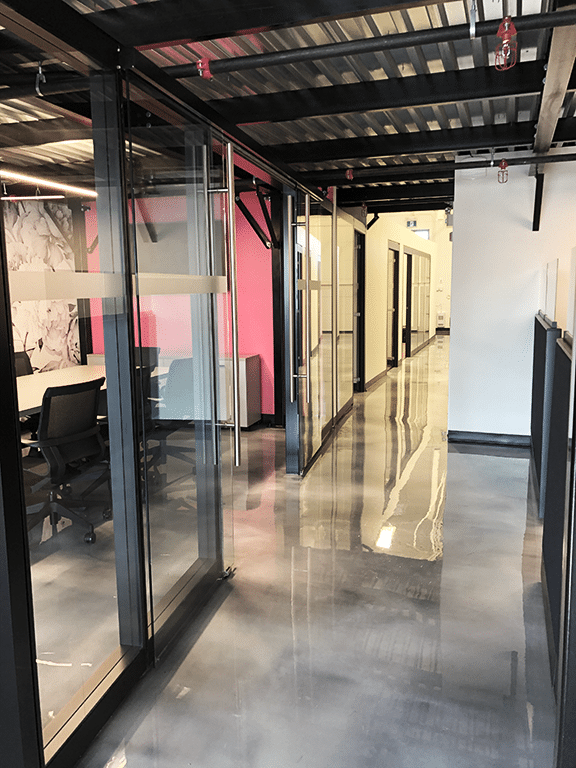 This striking feature serves as a bold declaration of Lander Realty’s brand identity, marrying the industrial aesthetic of the space with the elegance of the brand. The chain mail curtain embodies innovation and creativity, acting as a dynamic focal point that visually anchors the brand within the space.