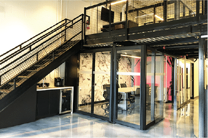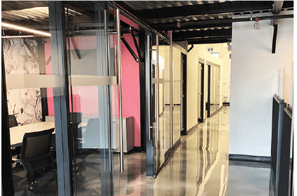 This design element introduces a layer of sophistication and vibrancy. The use of glass partitions to showcase this feature allows for a seamless flow of light and space, adding depth and dimension. This thoughtful integration of brand colours with the industrial backdrop exemplifies our commitment to creating spaces that are both beautiful and meaningful.