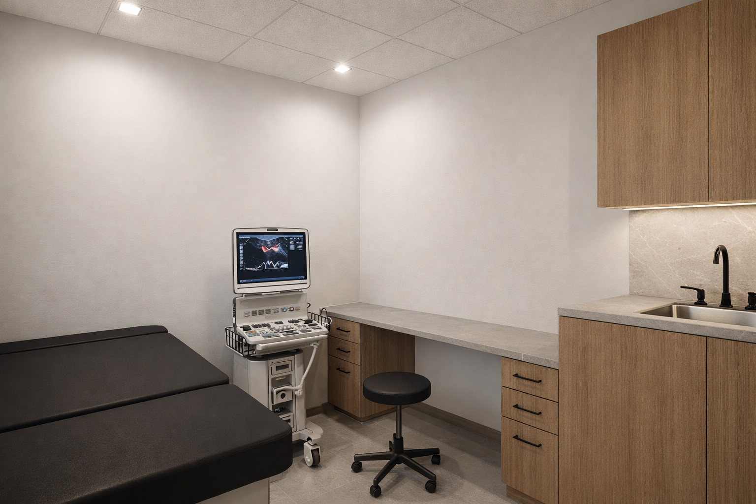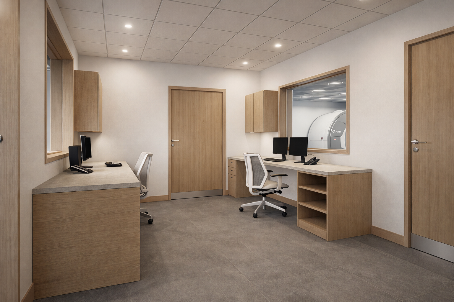 The clinic is organized to clearly separate public, diagnostic, and staff areas, supporting both privacy and operational efficiency. The reception and waiting areas are open and easily navigable, while corridors provide direct and efficient access to imaging and exam rooms. Support spaces, including control rooms and workstations, are strategically positioned to optimize staff movement and maintain a seamless patient experience.