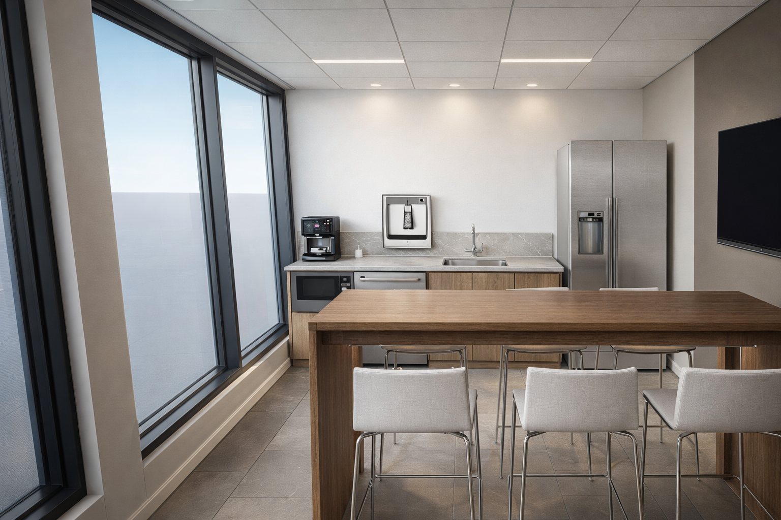 In the lunchroom, Studio Forma employed creative flooring and wall paint designs to fashion a cozy lounge area, evoking a sense of nature indoors. Custom millwork, adorned with murals echoing the outdoors, not only enhanced the aesthetic appeal but also fostered collaboration among team members, creating a welcoming and conducive environment for shared ideas and innovation.