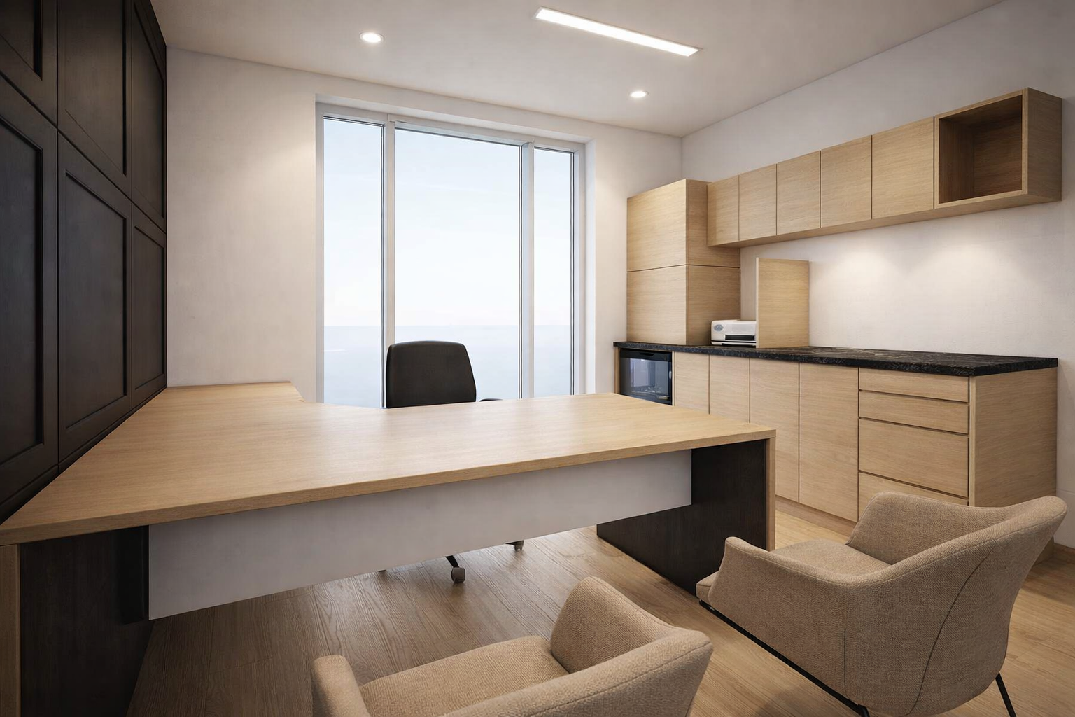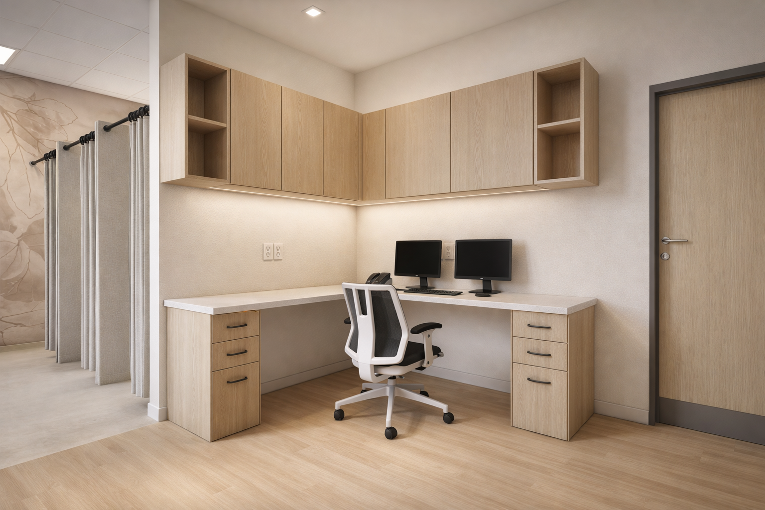 Throughout the clinic, antimicrobial surfaces — including seamless countertops, high-performance flooring, and easy-clean upholstery — were used to support strict hygiene standards. The design reflected the client’s desire for a warm yet contemporary aesthetic, with soft natural tones, abundant daylight, and tailored furniture solutions.