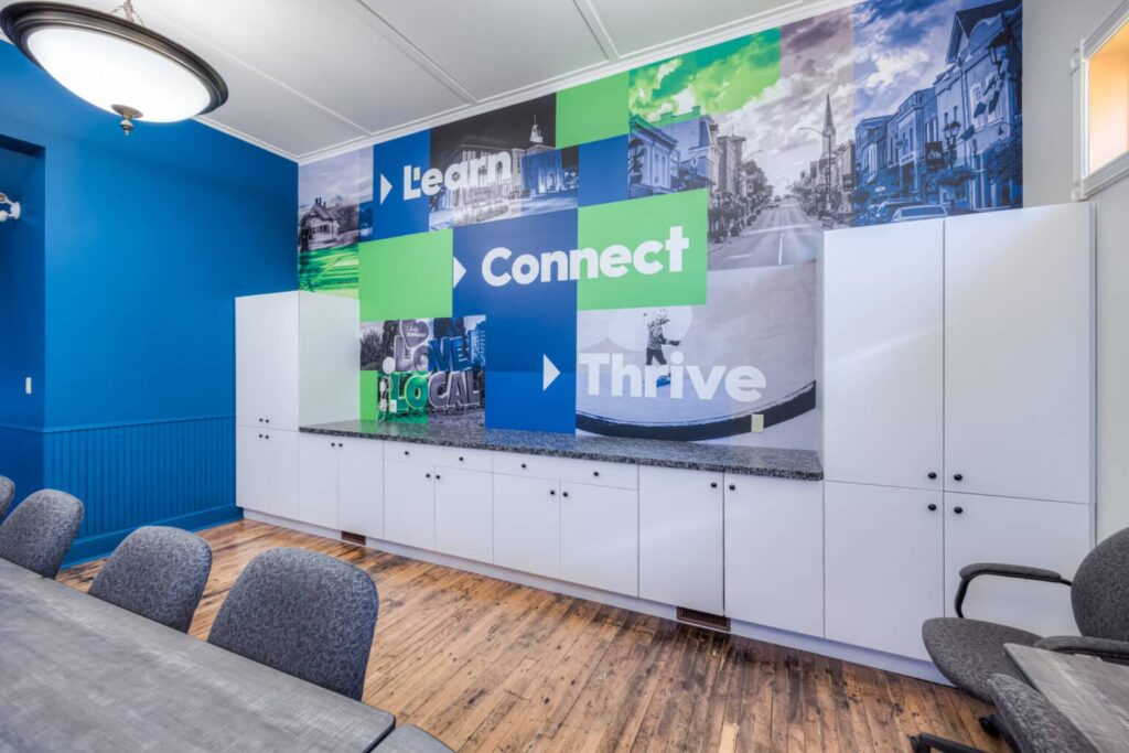 To underscore the Chamber's distinctive character and align with our brand identity, we introduced custom-designed features that serve as focal points within the space. Furthermore, the introduction of custom murals and installations adds a layer of personalization, making the Chamber's office a reflection of its vibrant community and forward-thinking vision.